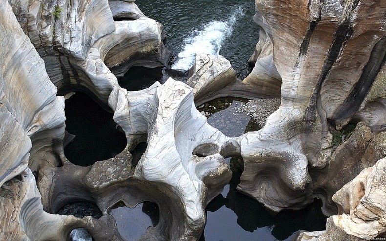 Bourke's Luck Potholes are a natural water feature found within the Mpumalanga province of South Africa, about 35km north of Graskop on the R532 road. Located at the beginning of the Blyde River Canyon, these cylindrical potholes on the bedrock have been carved over thousands of years by sand and pebbles swirling around in whirlpools when the Treur River plunges into the Blyde River. Initially, water borne pebbles carved out small depressions, which soon trapped river debris further accelerating erosion. The hollows grew over time and deepened to cylindrical potholes up to several meters deep.